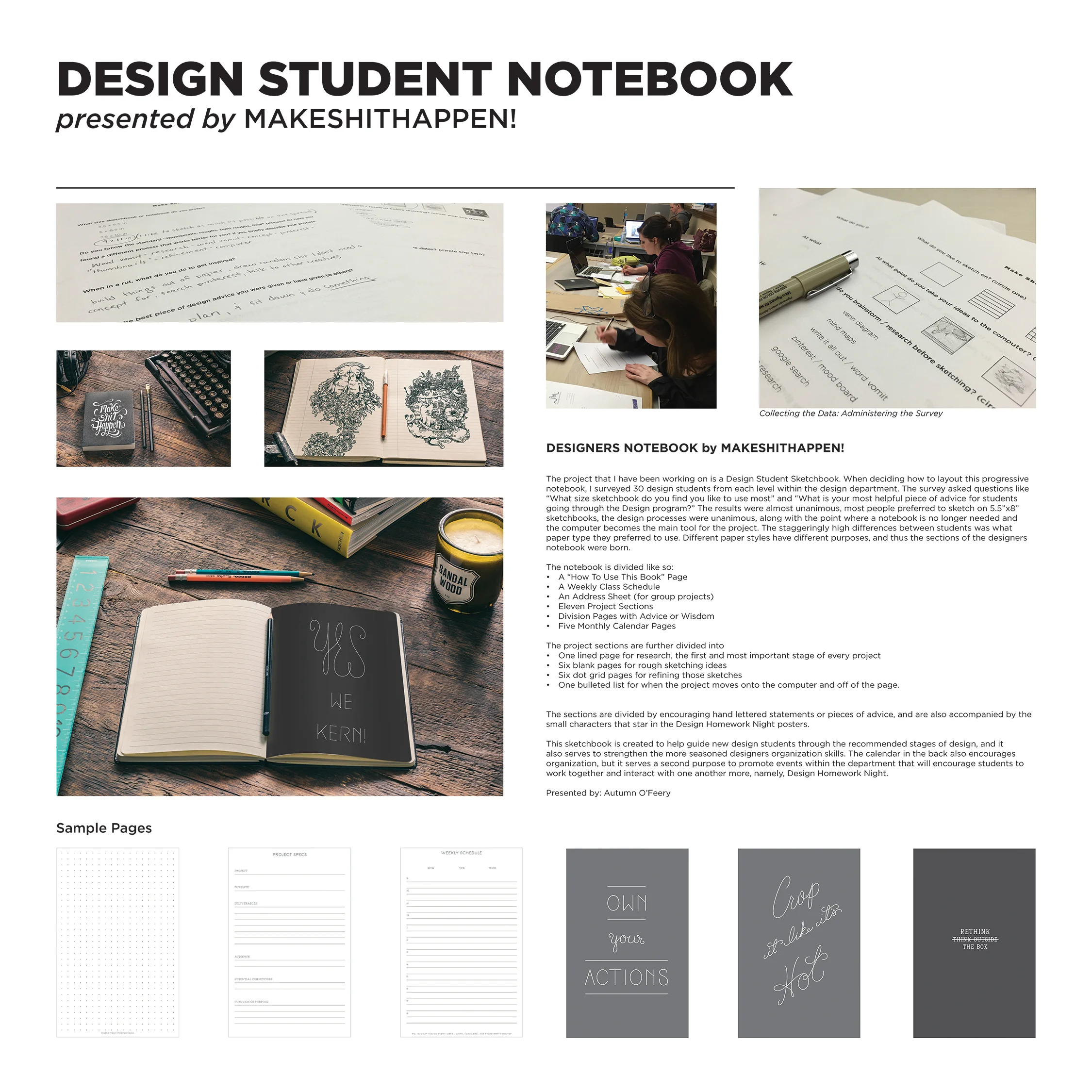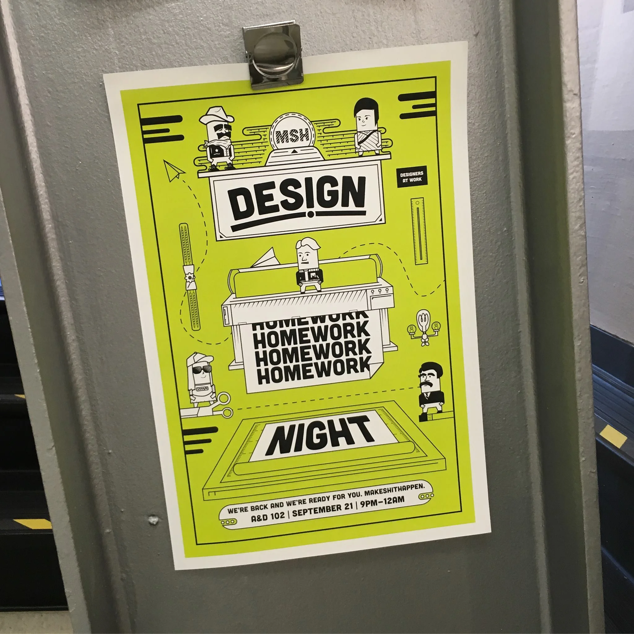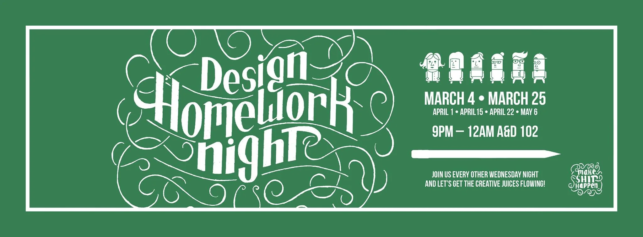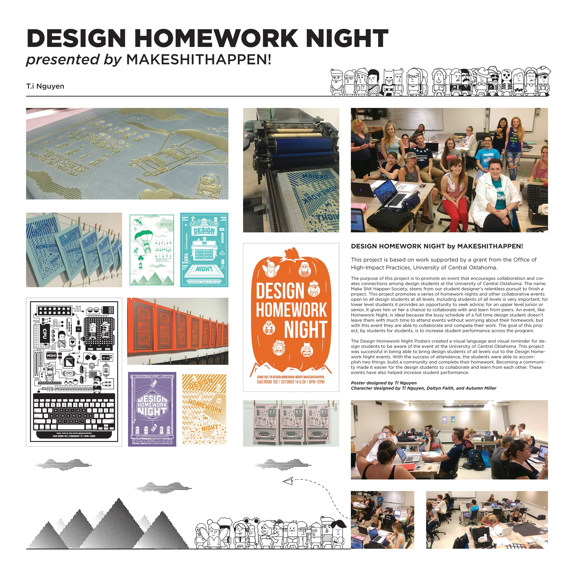 Midway through the semester Ti Nguyen and Daltyn Moeckel wanted to add an additional element to benefit Design Homework Night, a dedicated poster series that promoted the event, as well as a separate poster series that provided encouragement to students and created an additional level of belonging. Very much the idea of we’re all in it together we should help each other. Inspired by this idea T.i. formed The Make Shit Happen Society.