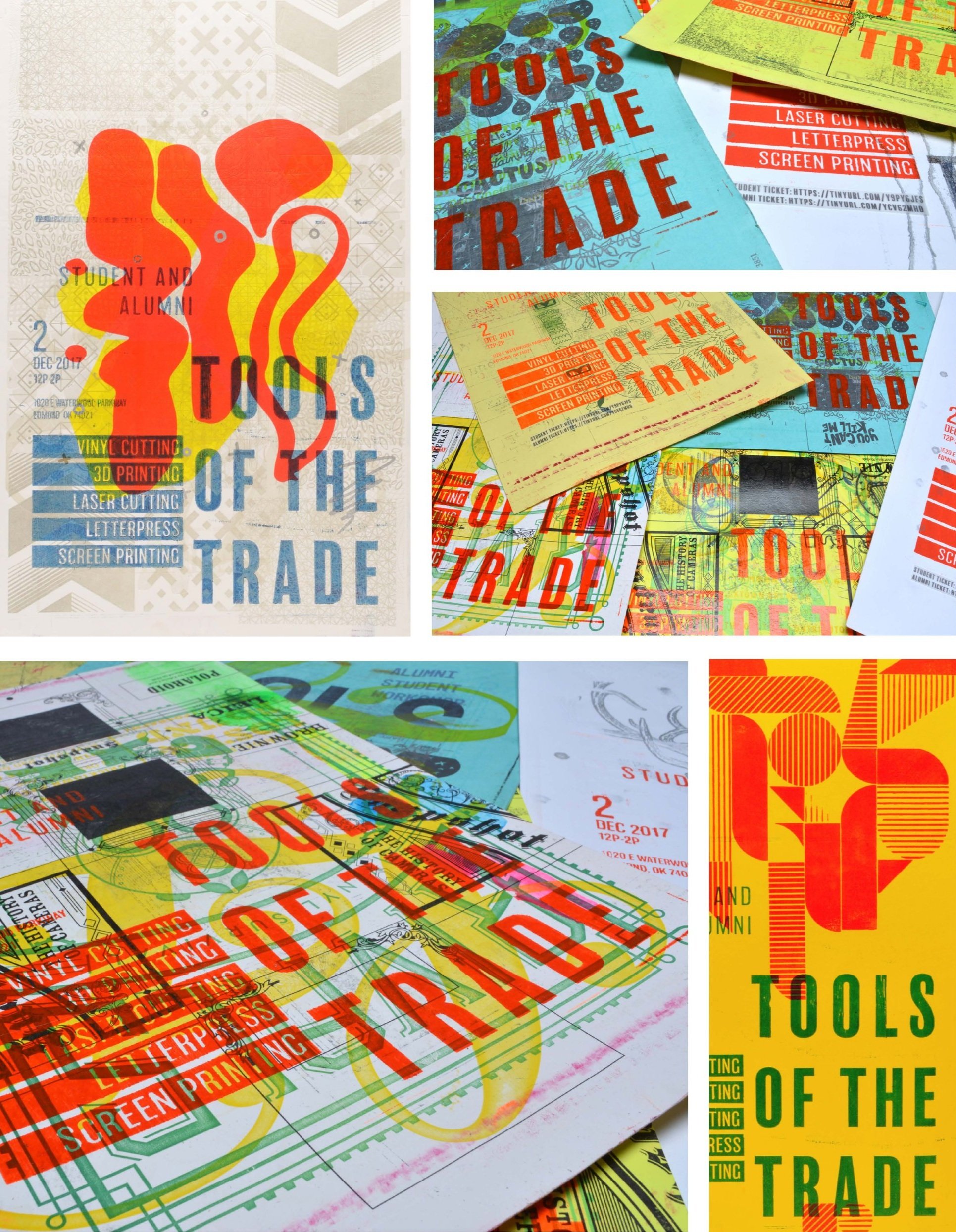 These letter-pressed and screen printed posters were designed and created for a workshop at University of Central Oklahoma School of Design to showcase our Letterpress & Prototyping Lab. Over time, Tools of the Trade, morphed into a 1-credit course that helped orient students to the technology in the lab.